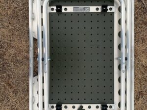 天板長辺のくり抜きは移動時の持ち運び用とランタンポール等をクランプできる場所として、両サイドのくり抜きはシェラカップや道具類を掛けるのに最適です。